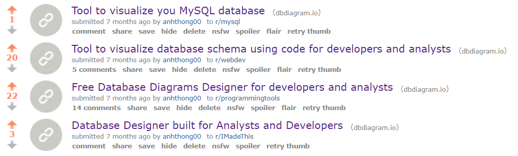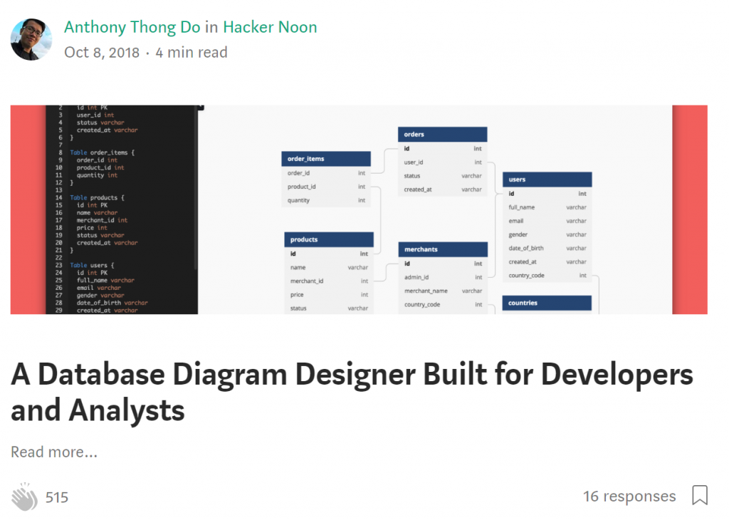 Since Hacker Noon has been a popular site among the tech community, we guest posted on Hacker Noon with an article introducing dbdiagram.io as a freebie to the community, titled A Database Diagram Designer Built for Developers and Analysts.