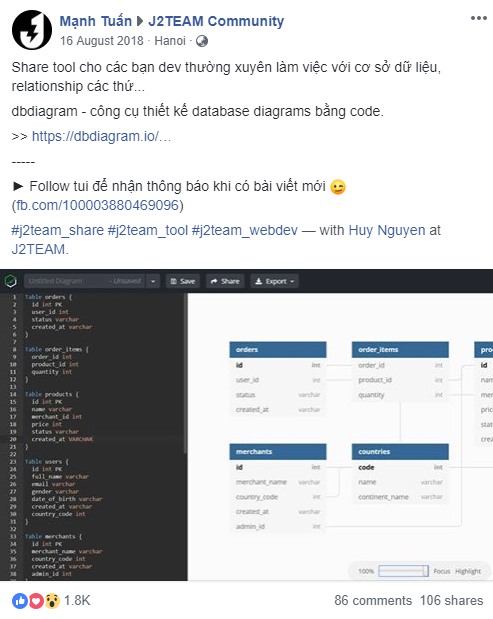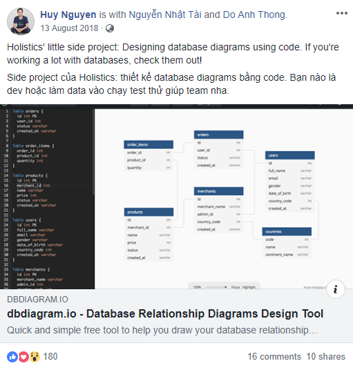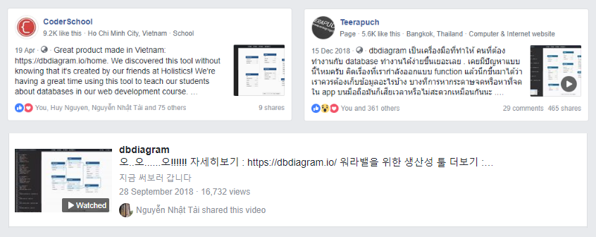 We asked our CTO - Huy Nguyen, who has quite an extensive network in Asia's tech community, to share about dbdiagram.io. After a few days, his share got caught by a few popular Facebook groups.