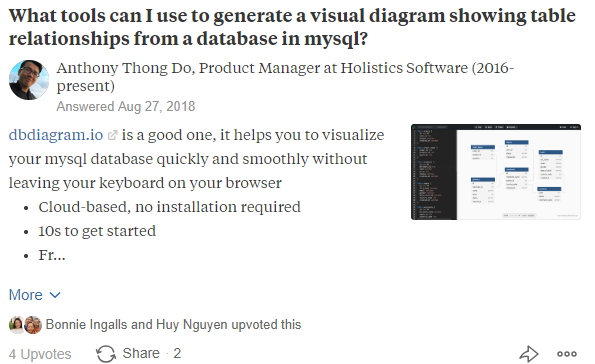 Posting on these channels still has some benefits, but we realized this was not a very promising channel as we cannot effectively control the traffic. For example on Quora, if someone asked "What is the best database diagram tool?" and there were already some reasonable answers, it is unlikely for our post to climb to the top #3.