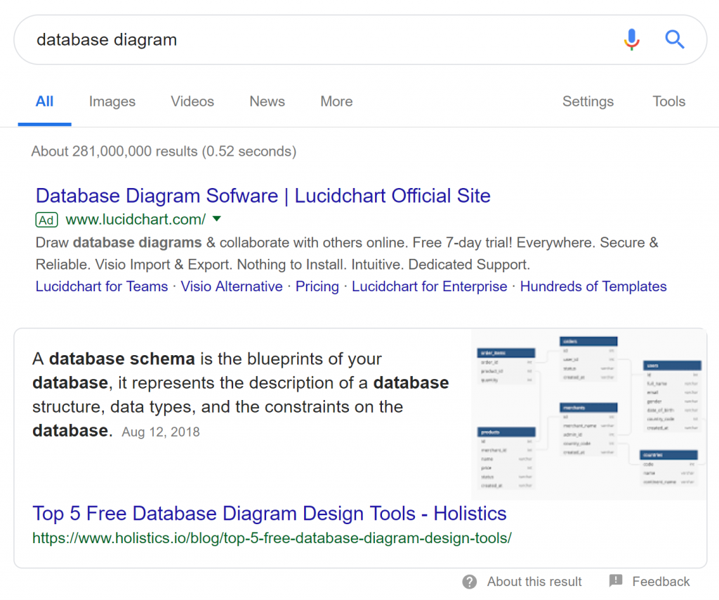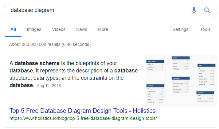 - The first paragraph: We wrote a paragraph with the definition of database schema which later was indexed by Google as the definition of a database diagram. This gave us an unexpected advantage on this keyword.
