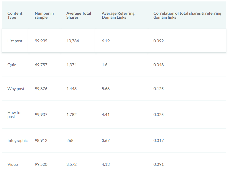 According to BuzzSumo analysis on 1 million articles, list posts generated more views and backlinks than other content types.