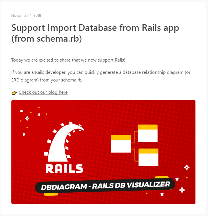 We decided to give dbdiagram.io the function to generate entity-relationship diagrams (ERD) from MySQL and Rails apps. This opened new doorways for us to reach out to the MySQL and Rails community via: