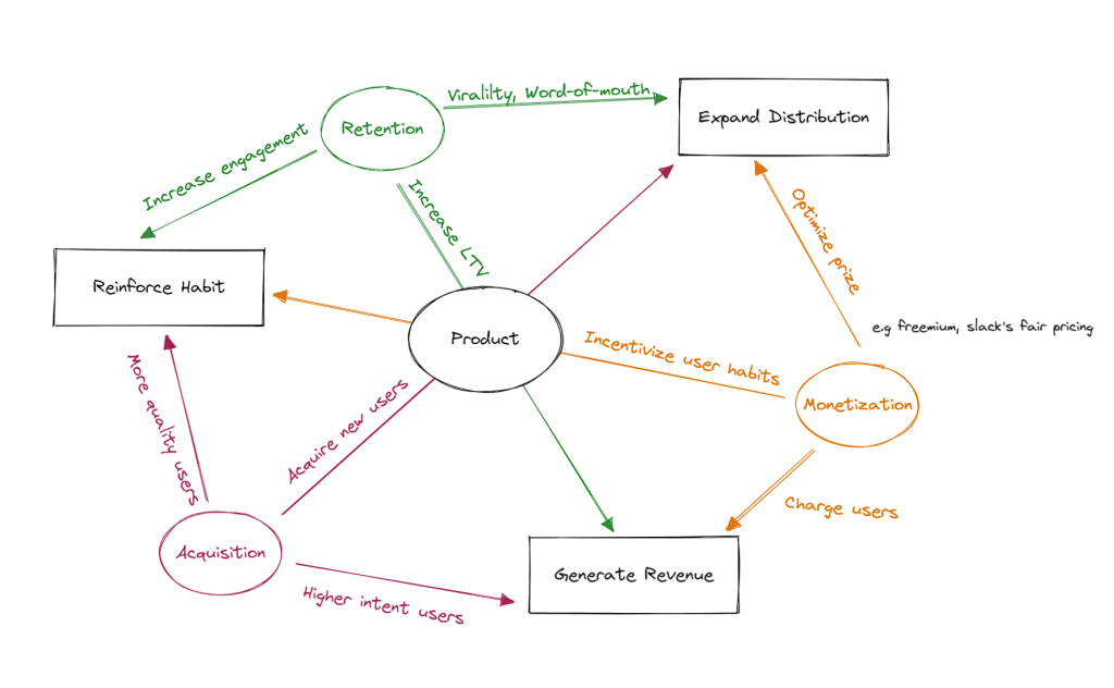 However, in reality, all the components are connected as part of a system that drives growth outcomes together. We should think of growth components as an interconnected system where investing in any component will improve the others (see my diagram below).