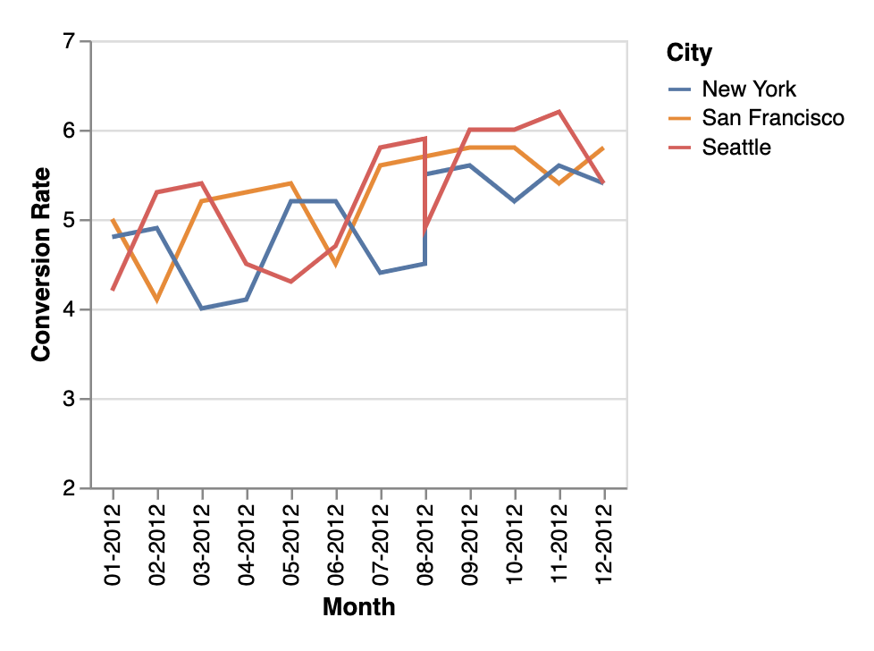 In San Francisco, the conversion rate started at 5.0% in January 2012, decreased in February and March, and then increased gradually before peaking at 5.8% in December 2012. In New York, the conversion rate started at 4.8% in January 2012, increased and peaked at 5.6% in September 2012, and then fluctuated between 5.2% and 5.6% until December 2012. Finally, in Seattle, the conversion rate started at 4.2% in January 2012, increased and peaked at 6.2% in November 2012, and then decreased to 5.4% in December 2012.