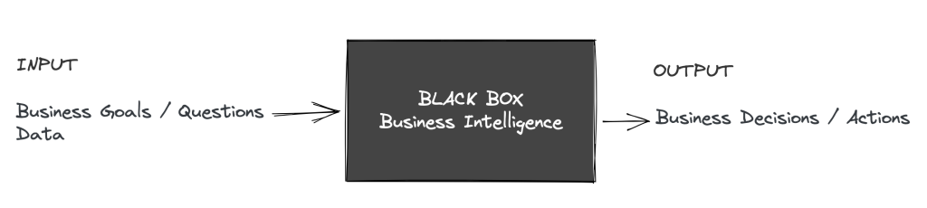 Using the Black Box Model, we can conceptualize BI as a process that takes business goals and data as inputs and produces decisions as outputs.