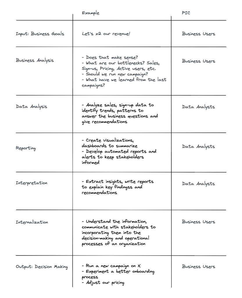 Caveat: (1) This workflow is not always linear and the output may generate new questions and inputs. (2) Some BI venders also provide data preparation or collection capabilities, which also have their own self-service solutions, where Service Providers of Data Analysts could be Analytics Engineer or Data Engineers. However, I will focus only on the reporting and analysis components.